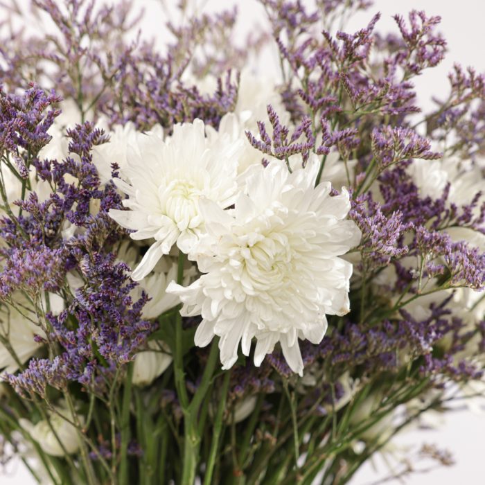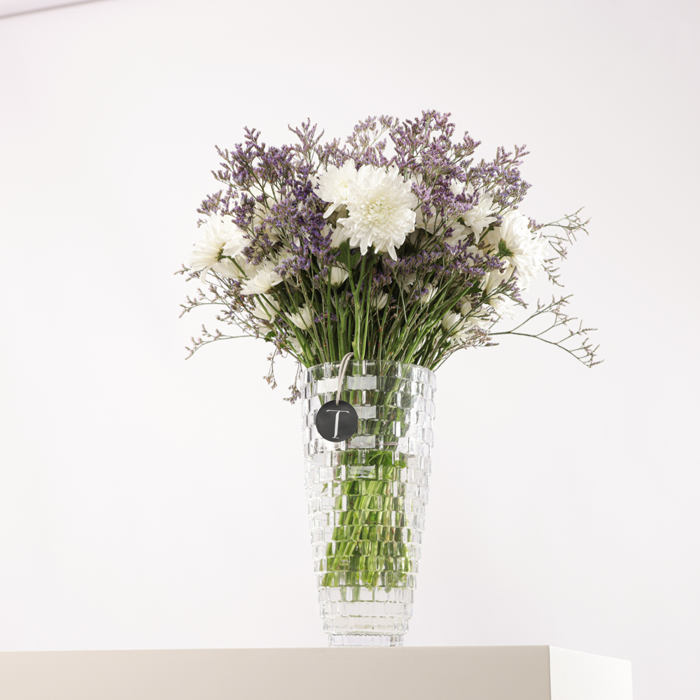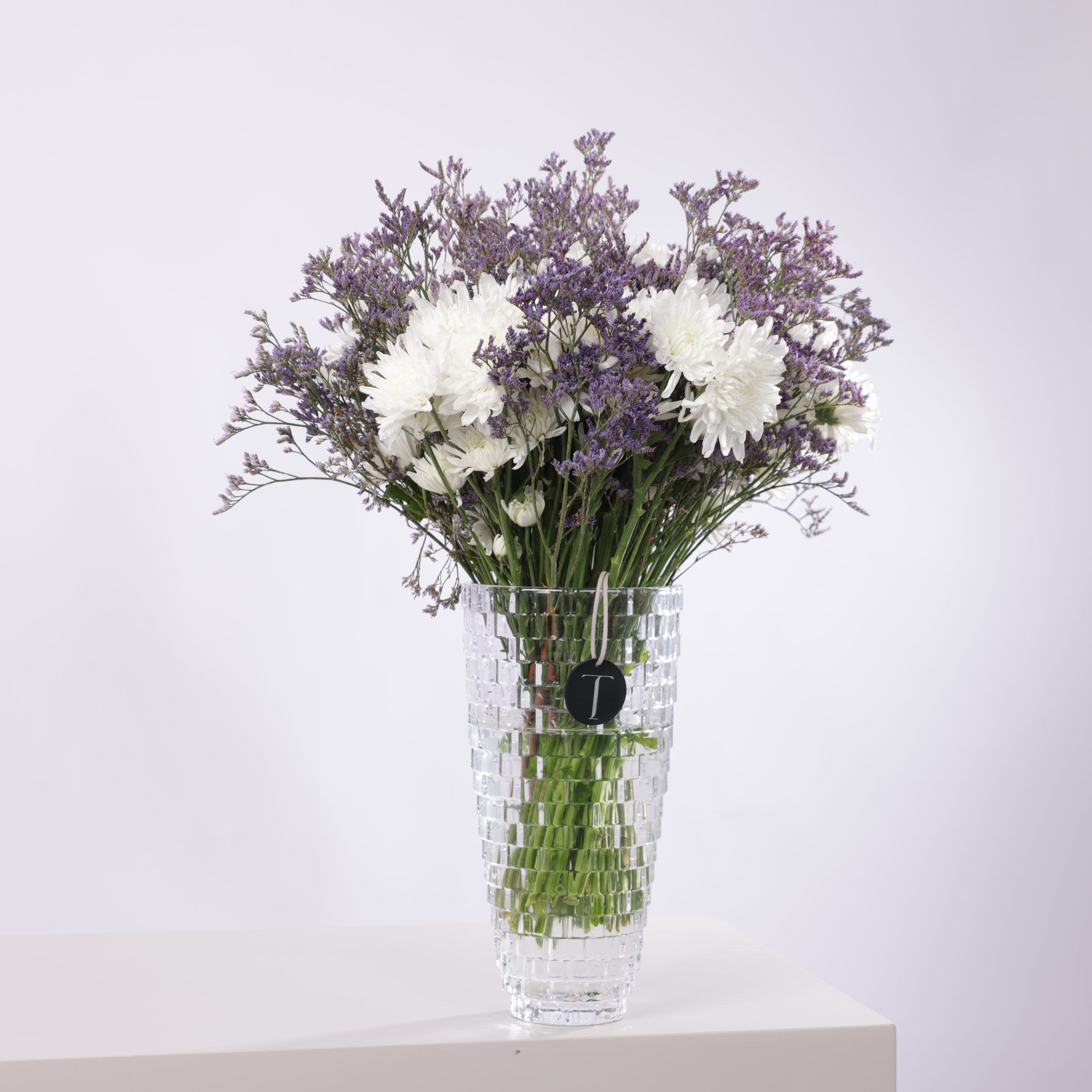 زهور أرجوانية أنيق في مزهرية زرقاء وبيضاء، مثالي للتعبير عن المشاعر الجميلة والحب